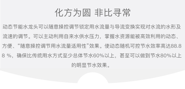 或可以更小流量獲得同等沖洗力的動(dòng)態(tài)調(diào)節(jié)適應(yīng)性使用功能優(yōu)勢(shì),自主把握節(jié)水適用效果與效益”。 達(dá)到了有效提高相同流量的利用效率,有效提高相同水量水的用水多樣化效果,實(shí)現(xiàn)水資源能被高效利用:
